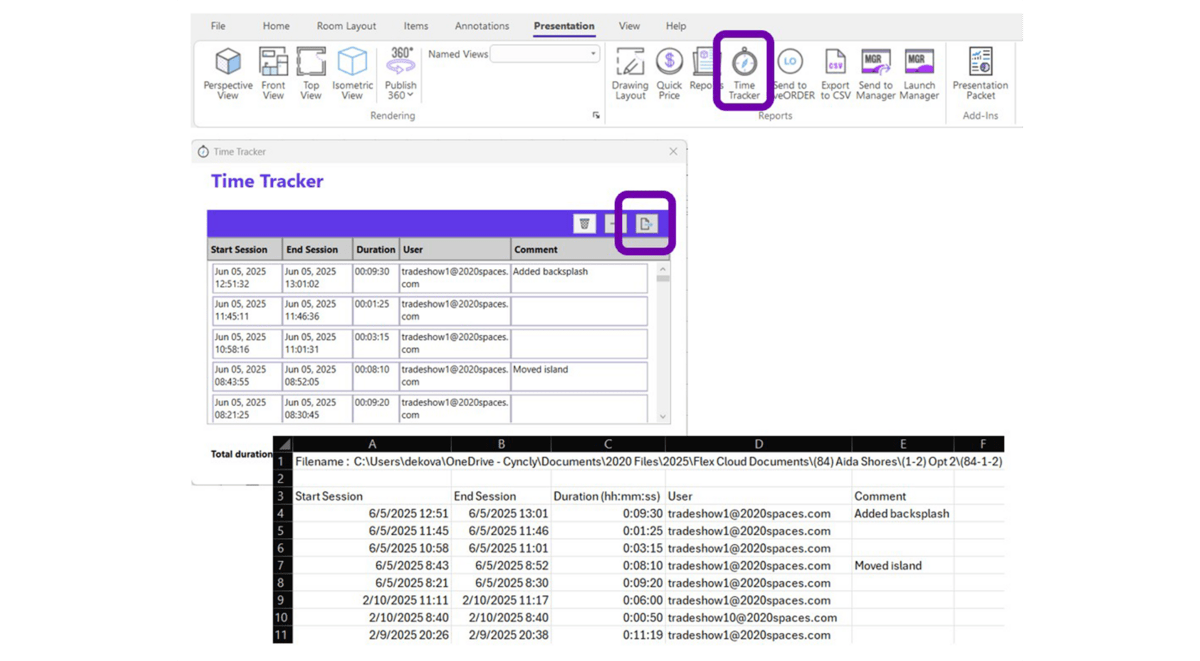 Plus de conjectures ! Design Flex suit désormais automatiquement le temps passé à créer ou à modifier des designs. Exportez ces données sous forme de fichier CSV structuré pour les rapports clients, les analyses d’équipe, la gestion de projet ou les intégrations de facturation.